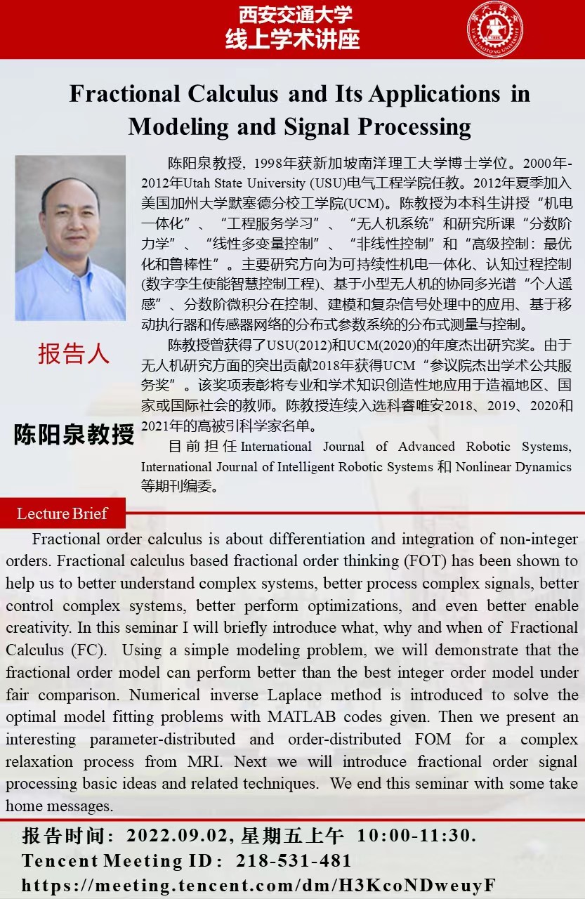 讲座题目:Fractional Calculus and Its Applications in Modelingand Signal Processing