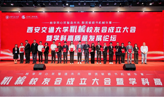 校友关系发展部主任许佳辉宣读西安交通大学机械校友会成立批复文件。洪军、单智伟,许佳辉、雷亚国共同为机械校友会理事颁发聘任证书。