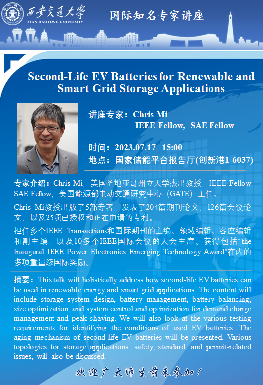 讲座题目:Second-Life EV Batteries for Renewable and Smart Grid Storage Applications