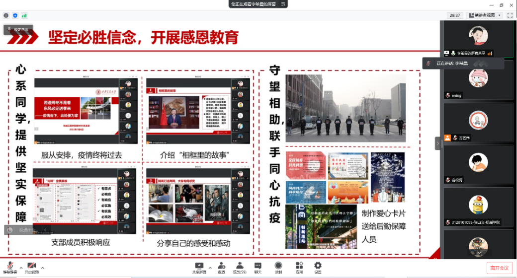 随后西交机械学院硕0003党支部书记李希晨同志对支部基本情况进行了介绍,然后回顾了年前疫情与学校的各项响应措施,在之前的抗疫过程中我们积累了宝贵的工作经验,因此可以高效有序地应对本次疫情。随后他从国家政策,总书记讲话、学校实施的抗疫举措、学院开展的抗疫文化活动、支部的志愿服务工作等方面向我们展现了西交抗疫经历,鼓励大家用科学的理论武装头脑、用智慧的方式防护自身、用积极的热情投身服务。疫情当下,与其被动地抱怨,不如主动地改变,相信在大家的共同努力下,疫情即将退去!