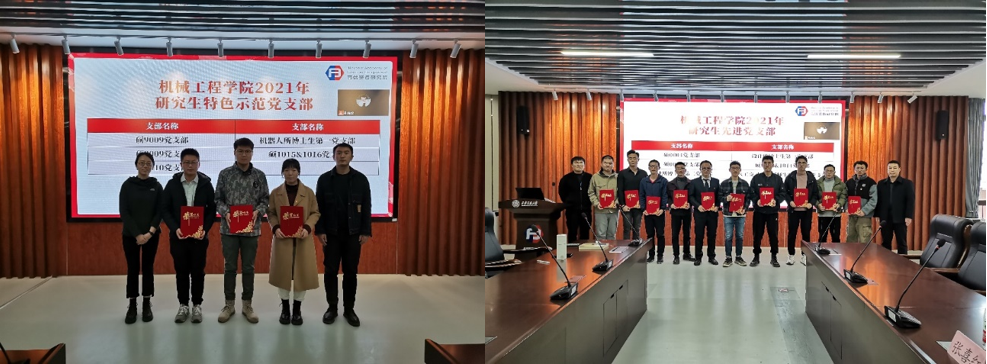 最后,根据汇总各支部成绩,确定了“硕9009党支部”、“机器人所博士生第一支部”、“机器人所博士生第三支部”、“硕1015&1016党支部”和“硕9010党支部”5个党支部获得“机械工程学院2021年研究生特色示范党支部”称号,并由李瑞萍老师和苏宇老师为支部进行了颁奖。确定了“硕0004党支部”、“设计所博士生第二党支部”、“硕0003党支部”、“硕1013&1014党支部”等10个支部为“机械工程学院2021年研究生先进党支部”,并由杨江坤老师和张喜红老师进行了颁奖。