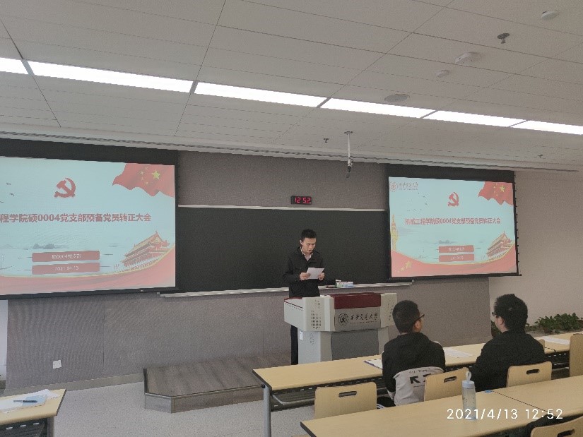 2021年4月13日,根据硕0004党支部发展党员工作计划,经征求党员和群众意见、支部委员会审查同意,硕0004党支部召开支部党员大会,讨论预备党员陈世省、韩宇飞、李超三名同志的转正问题。
