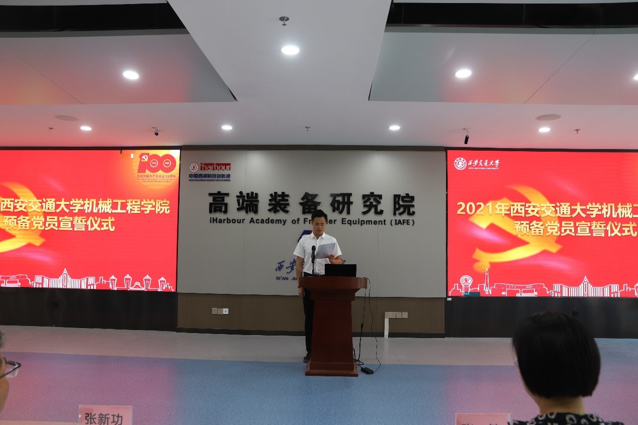 为庆祝中国共产党成立100周年,深入学习习近平总书记在庆祝中国共产党成立100周年大会上的重要讲话精神,教育引导广大学生党员坚定理想信念、砥砺初心使命,保持好党员的先进性,发挥好党员的先锋模范作用。7月1日,西安交通大学机械工程学院举行2021年新发展党员入党宣誓仪式,参加此次宣誓仪式的有机械工程学院党委副书记张敏,党委委员张新功,辅导员王芬、杨江坤、苏宇和2021年新发展的全体学生党员。