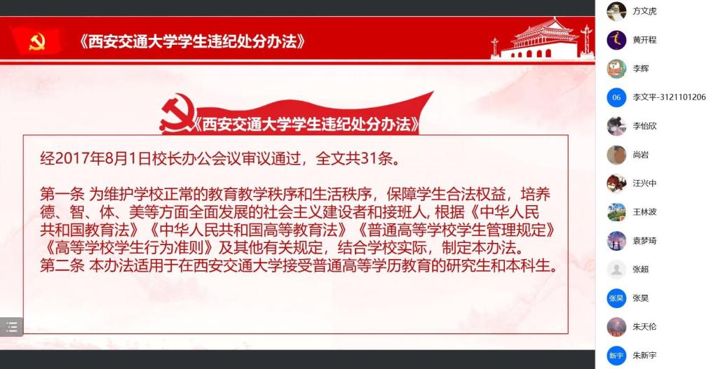在法律法规主题学习的第二部分中,孙志鹏同志带领党员同志们温习了《西安交通大学大学生违纪处分办法》,并着重强调了我校法规中网络使用的有关规定,严格要求党员同志们不得编造或传播虚假、有害信息,以身作则,弘扬先锋模范精神。