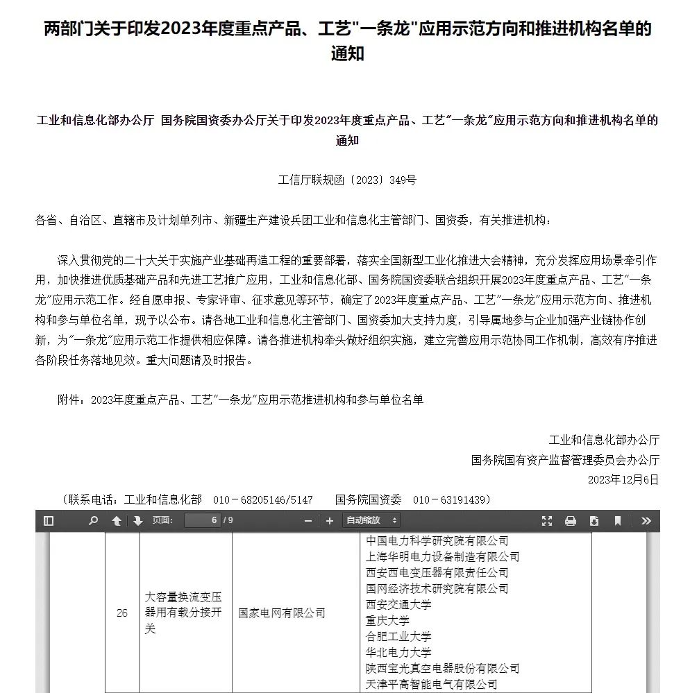 近日,工业和信息化部办公厅、国务院国资委办公厅两部门印发了2023年度重点产品、工艺"一条龙"应用示范方向和推进机构名单,机械工程学院洪军、张进华教授团队参与研制的我国拥有完全自主知识产权的“大容量换流变压器用有载分接开关”入选。