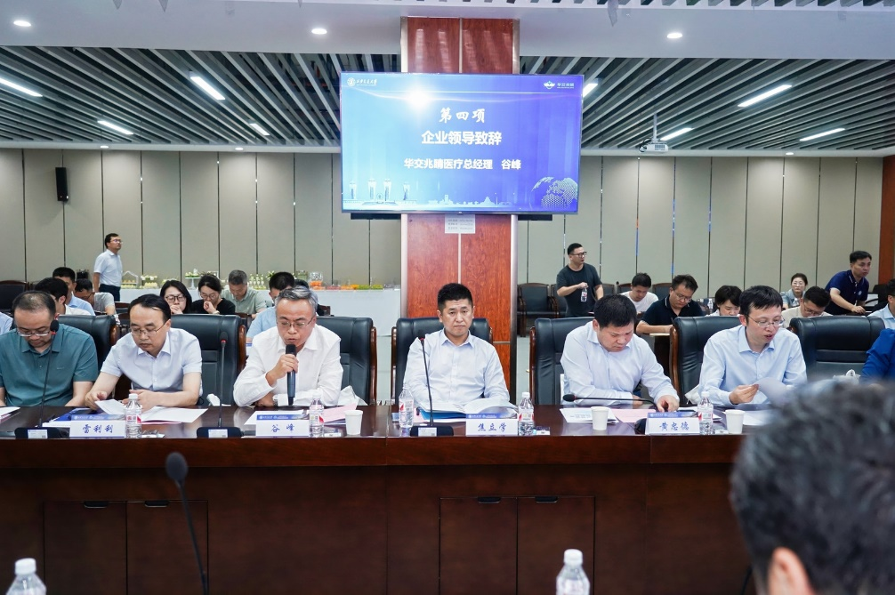 西安交通大学科研院副院长、产教融合与成果转化处处长陈娟与西安华交兆睛医疗器械有限责任公司总经理谷峰签署西安交通大学—华交兆睛医疗眼视光智能装备研究院共建协议。蒋庄德、黄忠德、温广瑞、焦立学见证签约仪式。